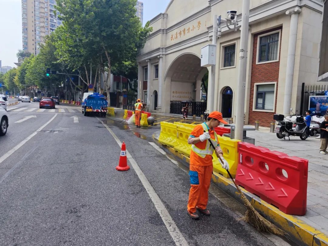 为营造干净整洁的校园周边环境,武汉市汉阳环卫集团错峰开展清洗作业,利用开学季前暑假期间人流量少的空档,采用“人机结合”的方式,对学校周边“强力度”清洗,主次干道全面清洗,人行道及公共设施、城市家具精细化人工清洗。