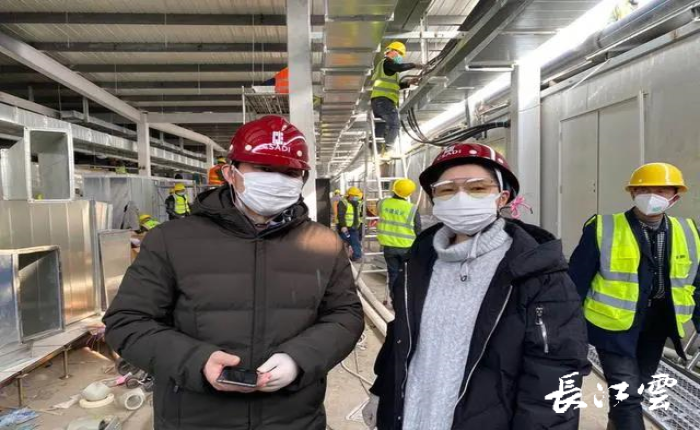 仇争艳(右)和技术总师在现场看医技区域施工情况。受访者供图