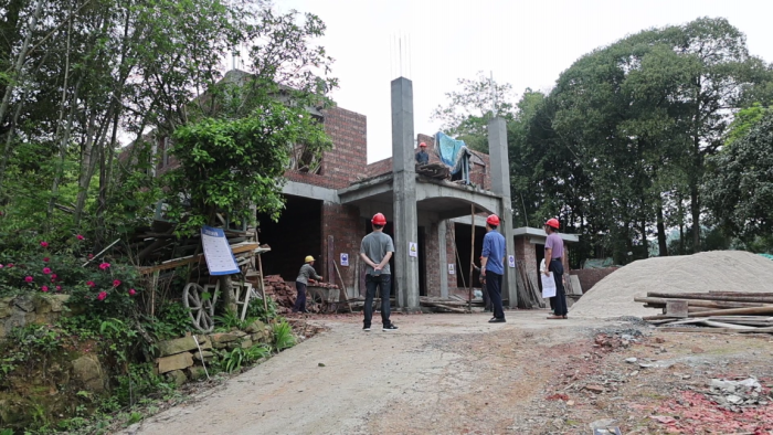 在库宗桥镇栾木村一栋在建的自建房工地上,安全警示标语十分醒目,师傅们正忙着砌墙、浇筑房梁,现场管理规范有序。今年春节过后,村民李红梅将住房建设工程承包给了乡村建设工匠刘捷,刘捷带领施工队严格按照设计要求规范施工,严格管理,整个工程质量、安全和进度都让她们十分满意。
