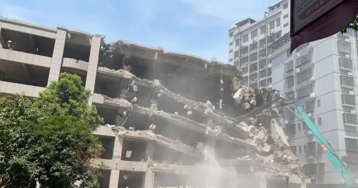 “这栋房子地基不稳,又加上楼体过高,周边建筑密集,8至15楼只能由人工拆除,下部负1层至7层则采用长臂炮机、挖机为主的机械拆除。”现场施工方相关负责人解释说,此次拆除时间相对较长是因为作业环境复杂。