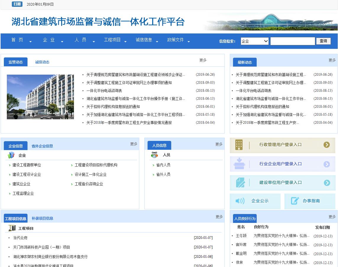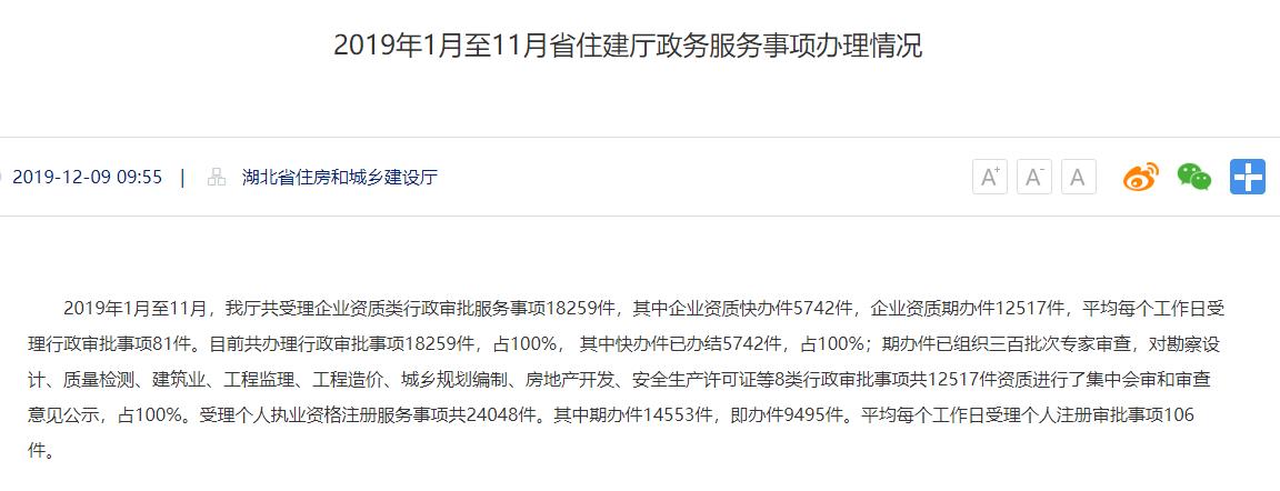 (一)《政务公开工作要点》落实情况。根据《湖北省住房城乡建设领域重大建设项目批准实施和公共资源配置政府信息公开实施方案》,施工许可审批信息、招标投标信息、施工有关信息、质量安全行政处罚情况信息等通过湖北省建筑市场监督与诚信一体化工作平台公开;超限审查信息通过巅峰国际(中国)官方网站 网站公开;其他涉及住建领域的信息由各地行业主管部门公开。目前,湖北省建筑市场监督与诚信一体化工作平台共设有4个数据库(行业企业数据库、从业人员数据库、工程项目数据库、诚信信息数据库)和1个业务办理平台(含各类工程建设审批业务和监管业务)。目前已入库建筑施工企业14238家(其中省内企业9023家、省外企业5215家)、人员294555人(含设计、施工等各行业从业人员)、项目56505个,以上信息均可通过该平台公开查询。根据建设工程项目实施阶段的管理实际,对建设项目等环节的管理信息和办理过程全部实行网上公开,建设单位可通过该平台直接办理项目报建、招投标登记等手续,施工单位可通过该平台直接办理企业信息录入、人员信息录入手续等,大大减少企业时间,提高工作效率。2019年9月,公开了超限高层建筑工程抗震设防措施落实检查情况。