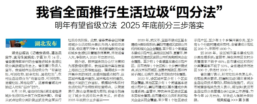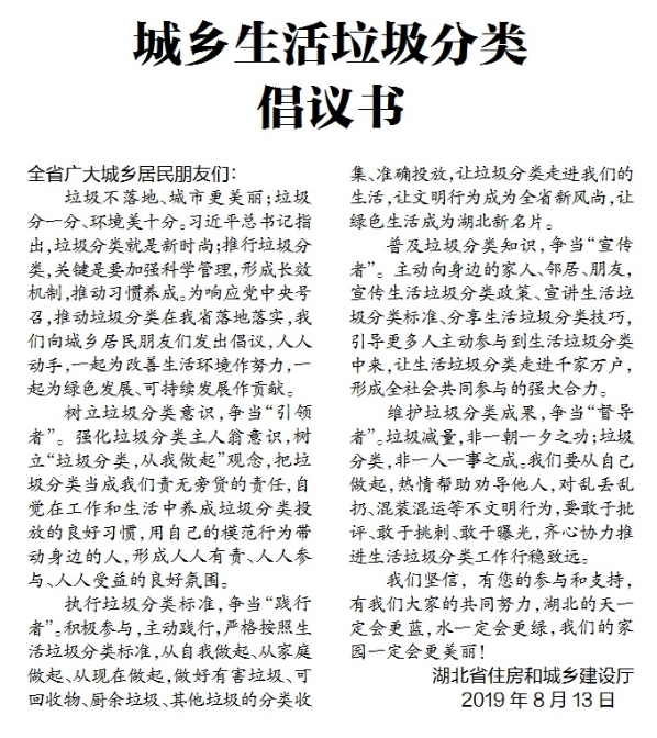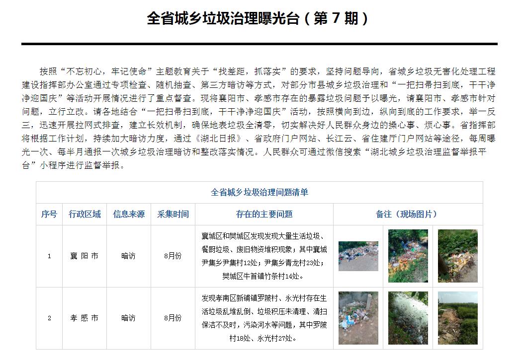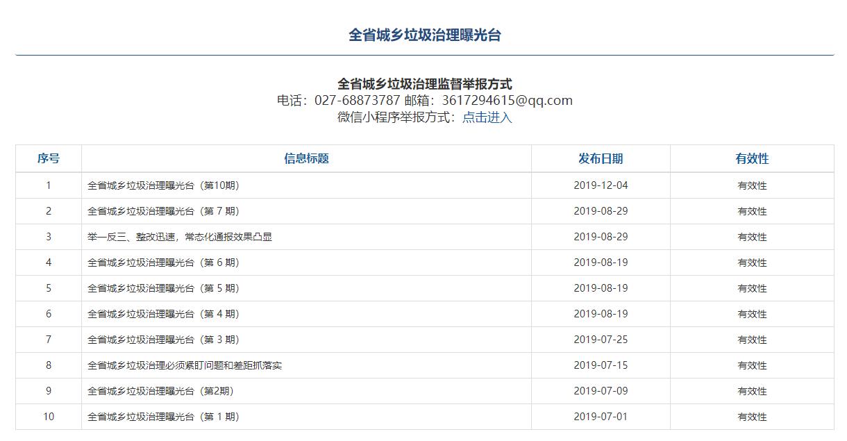 3.城乡生活垃圾无害化处理。2019年,继续做好《湖北省城乡生活垃圾无害化处理全达标工作简报》发布工作,及时公开工作进展情况。同时,建立湖北城乡垃圾治理监督举报平台,以图文结合的形式,集中发布市县城乡垃圾治理和“一把扫帚扫到底,干干净净迎国庆”等活动督查情况。通过巅峰国际(中国)官方网站 网站、《湖北日报》等媒体发布全省城乡垃圾治理曝光台信息8个批次。2019年7月,央视《新闻联播》节目“不忘初心、牢记使命”主题教育进行时部分报道了我厅开展垃圾治理工作情况。