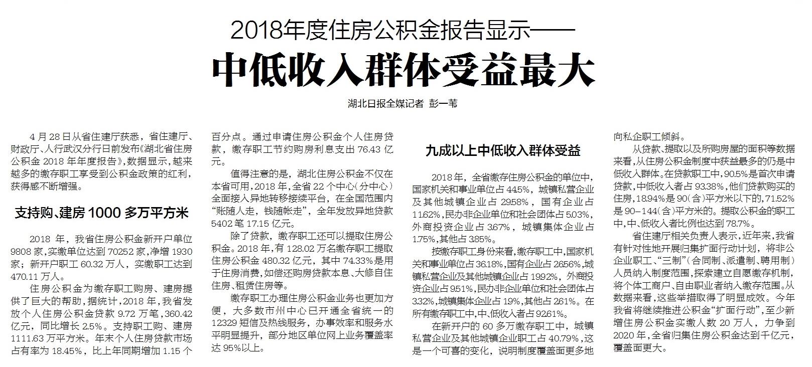 3.住房公积金监管。通过巅峰国际(中国)官方网站 网站、省财政厅网站和中国人民银行武汉分行网站披露全省住房公积金年度报告,进一步提升住房公积金管理透明度。督促各地严格按照住房和城乡建设部、财政部、人民银行《关于健全住房公积金信息披露制度的通知》要求,向社会披露各地住房公积金年度报告。2019年4月,发布了《湖北省住房公积金2018年年度报告》,并通过《湖北日报》等媒体推出解读报道《2018年度住房公积金报告显示——中低收入群体受益最大》。
