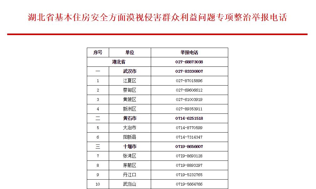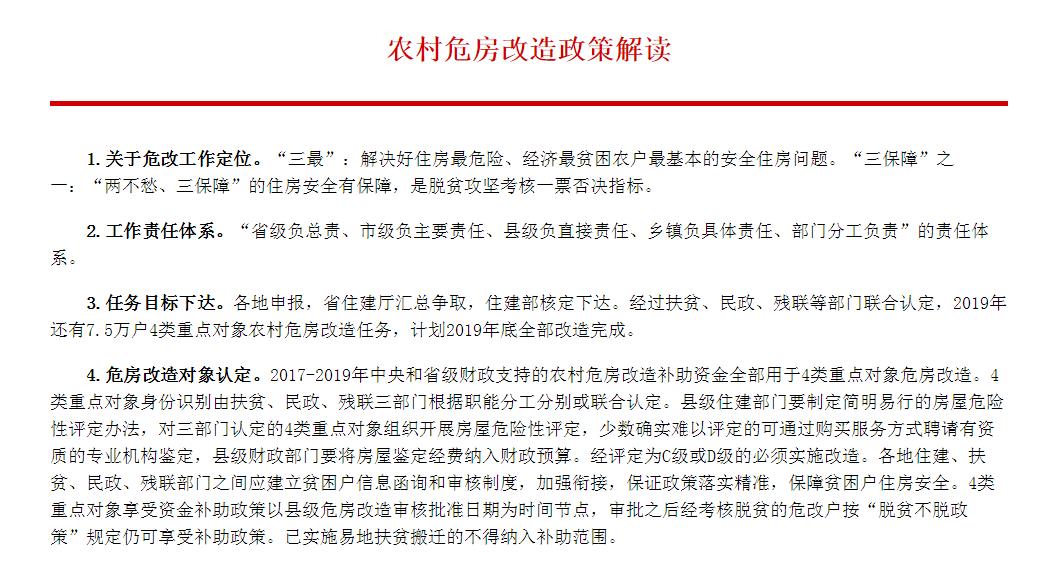 2.农村危房改造。严格按照“户申请、组评议、村评议公示、乡镇审核公示、县批准”的程序,阳光操作,透明化管理。指导各地认真落实危房改造项目资金公告公示工作,制作《农村危房改造政策明白卡》免费发放到每个危改户,让广大农民群众充分了解和掌握农村危房改造补助对象、补助标准、申请程序、建设方式、工作要求等基本政策。县级住建部门设立农村危房改造举报电话,在各村村务公开栏显著位置公示。通过巅峰国际(中国)官方网站 网站公开农村危房改造政策文件、工作进展情况等。2019年8月,发布了《农村危房改造政策解读》,重点就农村危房改造工作定位、工作责任体系、任务目标下达、危房改造对象认定、审批程序、改造方式、补助标准、面积标准、质量管控、检查验收、资金拨付、档案建立、信息录入、政策宣传、业务培训等15个方面做了介绍;10月,开展湖北省基本住房安全方面漠视侵害群众利益问题专项整治,公布了省级及各市(县)举报电话共107个。