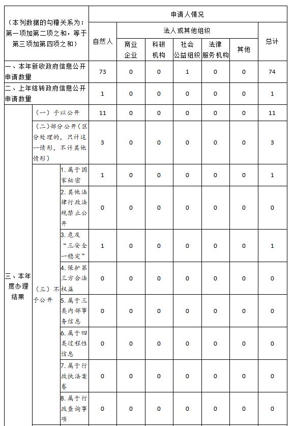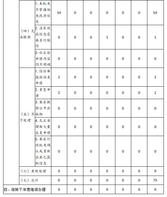 2019年,我厅共处理政府信息公开申请75件,其中新收到政府信息公开申请74件、上年结转政府信息公开申请1件,予以公开11件、部分公开3件,不予公开2件,无法提供55件,不予处理的5件。