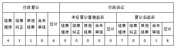 2019年,我厅发生6起因政府信息公开申请的行政复议,结果维持1起,结果纠正1起,其他结果1起;发生8起因政府信息公开提起的行政诉讼,结果维持7起,尚未审结1起。