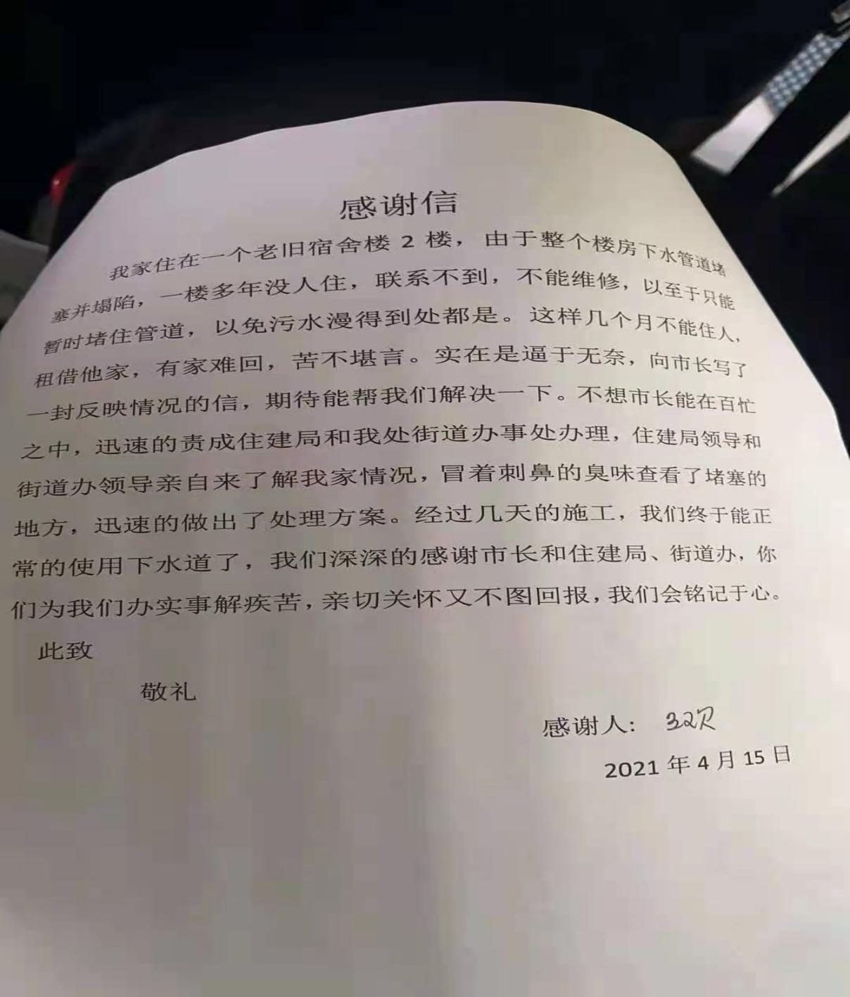 有家不能归,真是苦煞人。2021年3月25日,王欢抱着试试看心理,给市政府及有关部门写信反映,诉说自己的苦恼。3月29日,市领导签批意见,要求市住建局安排力量迅速解决。得知情况后,市市政工程管理局立即安排施工人员上门查看,并联系社区居委会和派出所,打开一楼住户铁门,实施了整层楼栋污水管道疏浚工作,并在不到一米宽的巷内,重新安装了60米长的接污管。通过几天的勘察、施工,王欢家里的生活污水终于顺畅排出了。