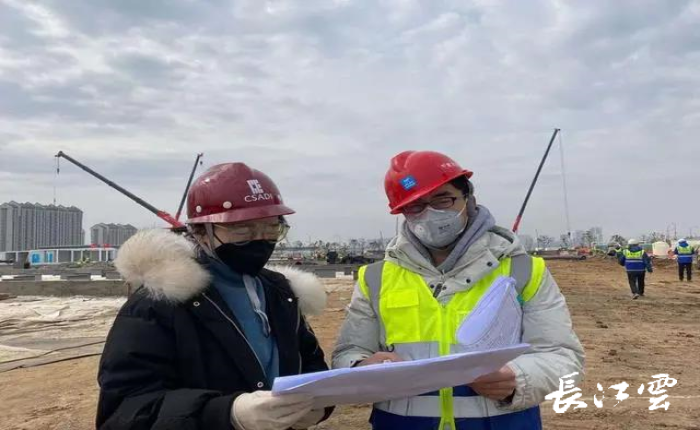 仇争艳(右)和技术总师在现场看医技区域施工情况。受访者供图
