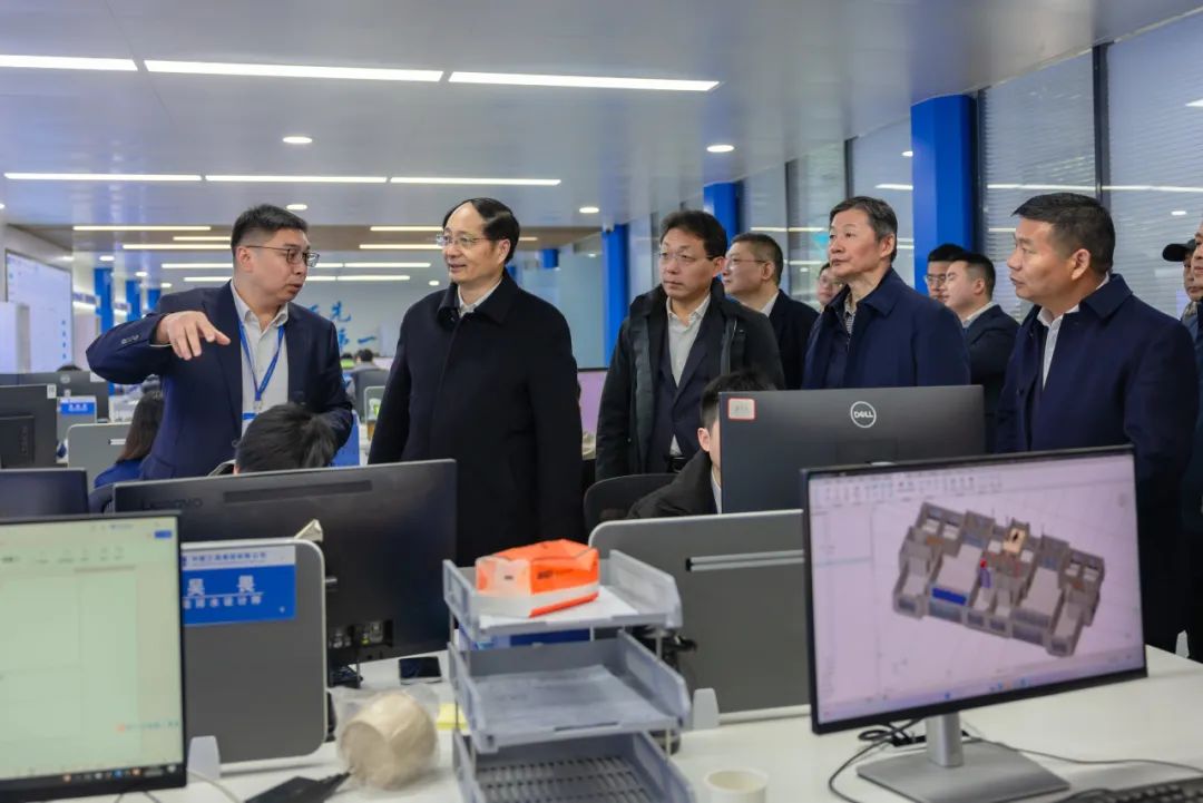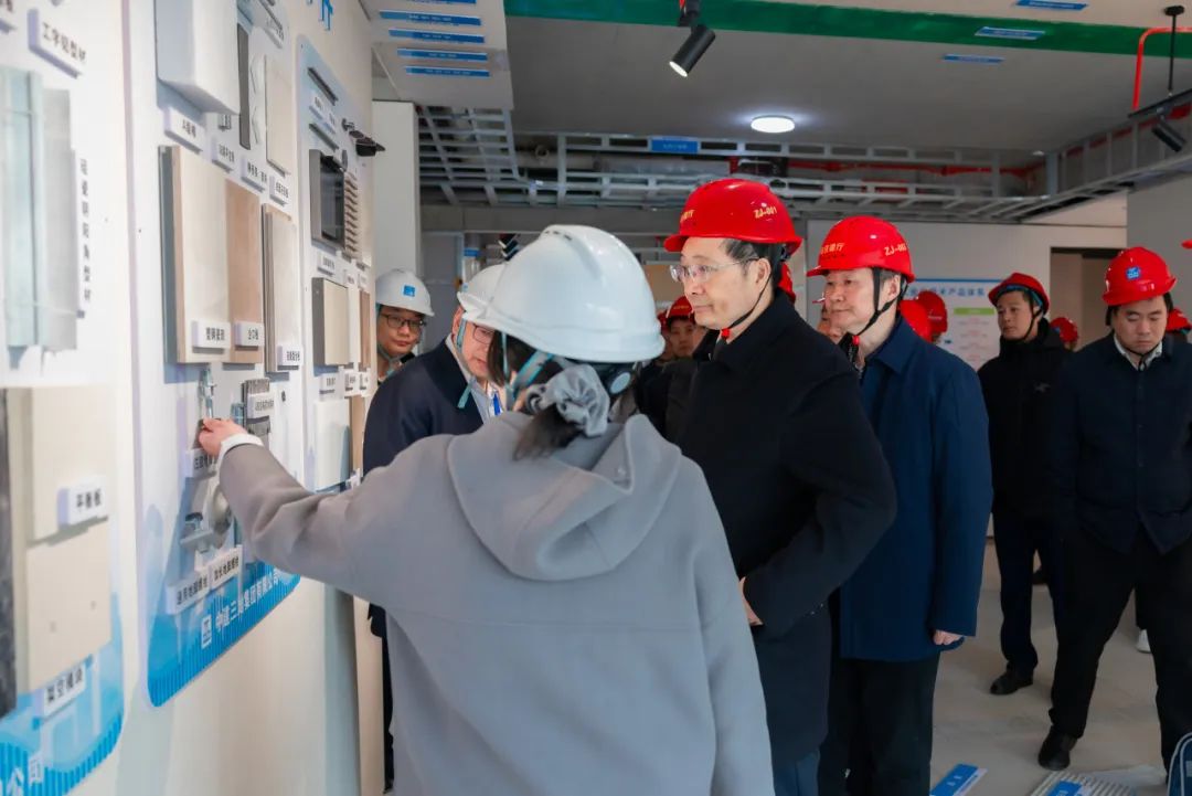 刘丰雷一行实地查看了项目数字建造中心、智能塔机集控室、装配式造楼机、2#楼三层装配式装修样板间等,详细了解了基于国产BIM的标准化、模数化正向协同设计,数据交互、数据驱动工厂、智能建造平台建设,智能塔机远程集中控制,装配式装修在模数化、标准化、工业化、数字化方面的应用实效等。