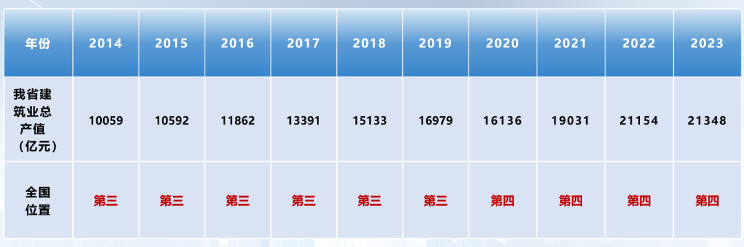 建筑业是国民经济重要的支柱产业。2014~2019年,我省建筑业总产值连续6年位居全国第三、中部第一,2020~2023年,连续四年全国第四、中部第一。
