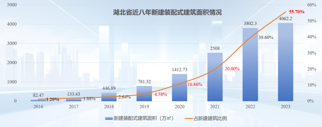 装配式建筑稳步发展。由2016年82.47万㎡增长到2023年4062万㎡,2016-2023年,全省新建装配式建筑面积累计达到1.32亿㎡。2023年,新建装配式建筑占新建建筑比例达到55.7%。2023年11月,在浙江温州召开的全国智能建造工作现场会上,我省的试点工作经验得到王晖副部长的充分肯定。