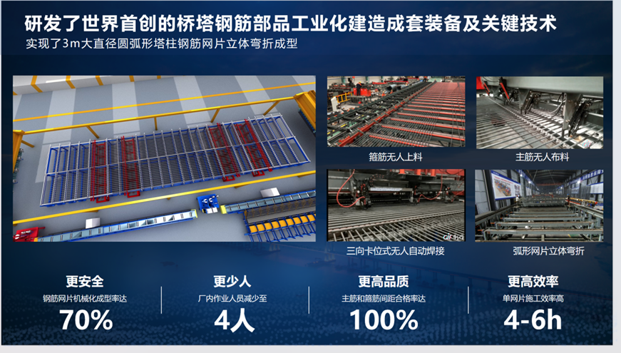 中交二航局研发的世界首创的桥塔钢筋部品弧形钢筋网片柔性制造生产线。