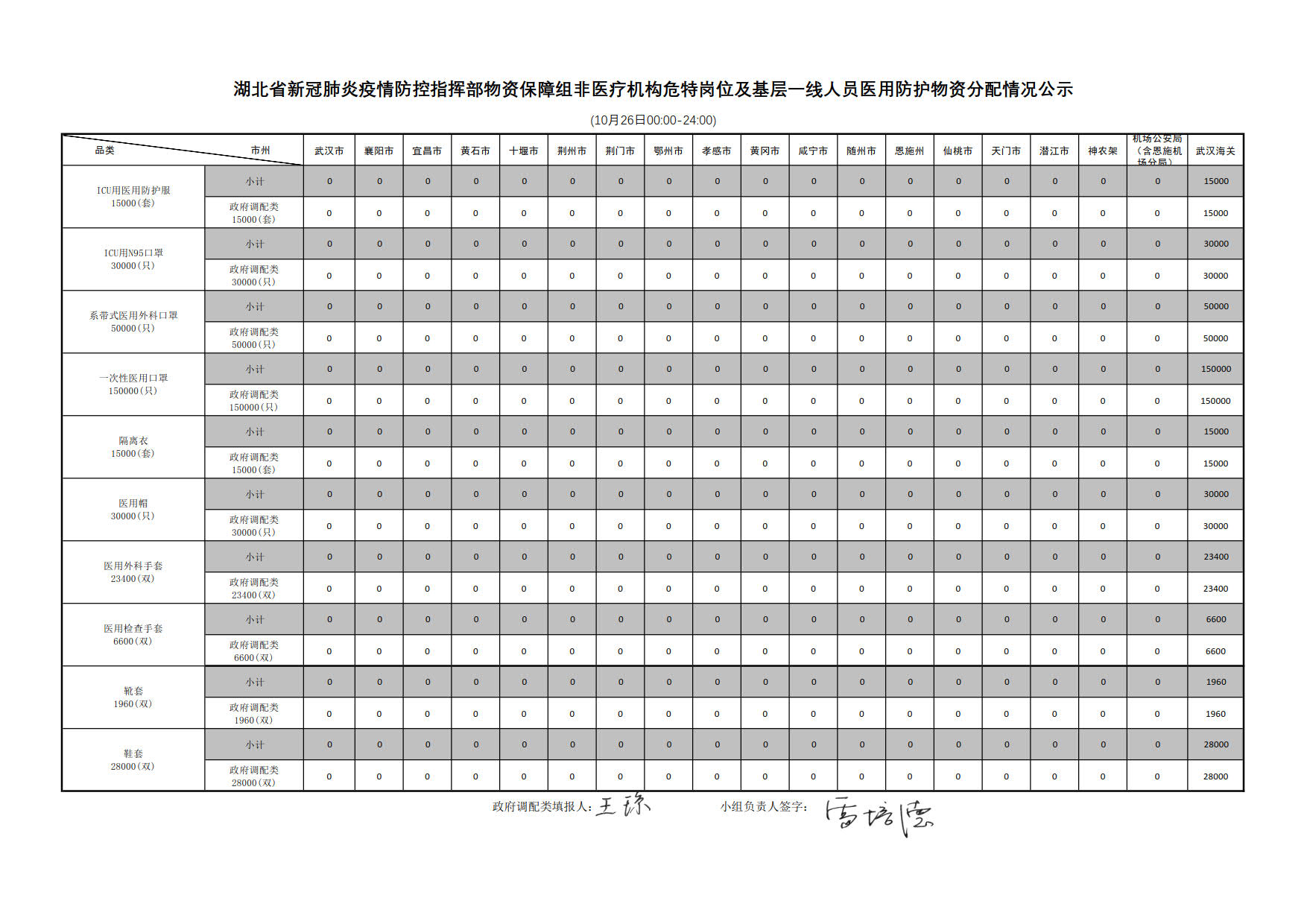 湖北省新冠肺炎疫情防控指挥部物资保障组医用防护物资分配情况公示(10月26日)